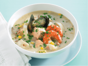 É uma sopa de frutos do mar preparada com salmão, uma mistura de frutos do mar e batatas.